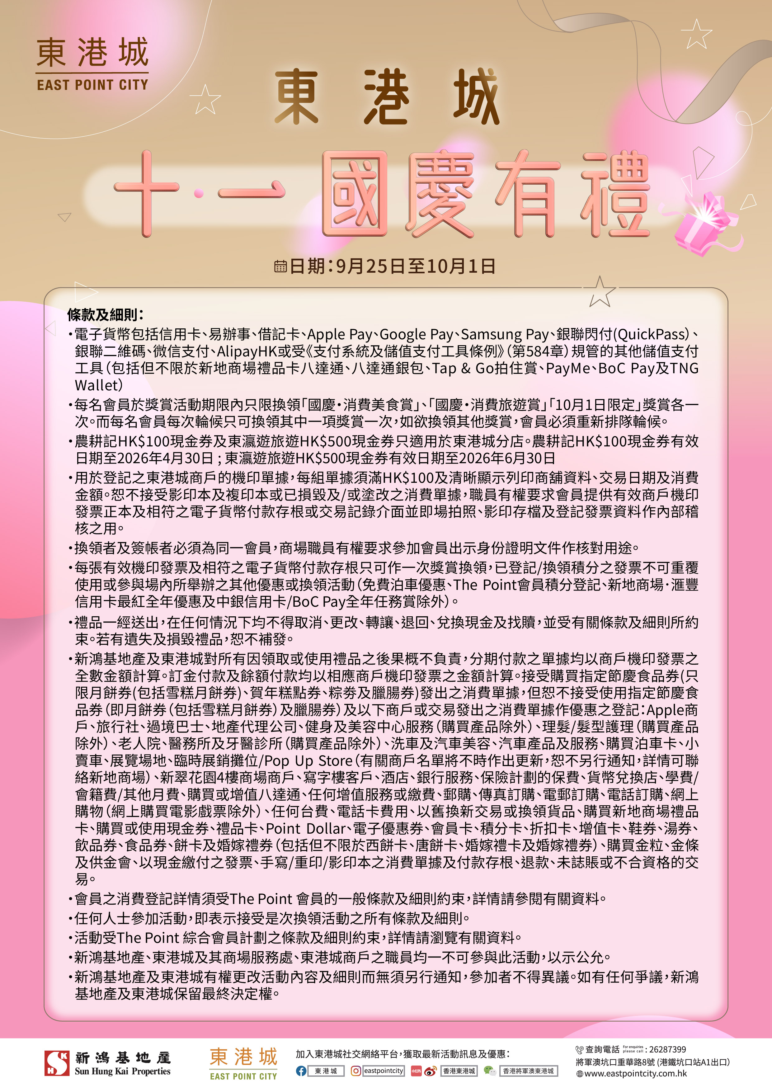 From Sep 25 to Oct 1, The Point members can redeem one of following rewards with designated spending at "Instant Point Earn" participating merchants for celebrating National Day: