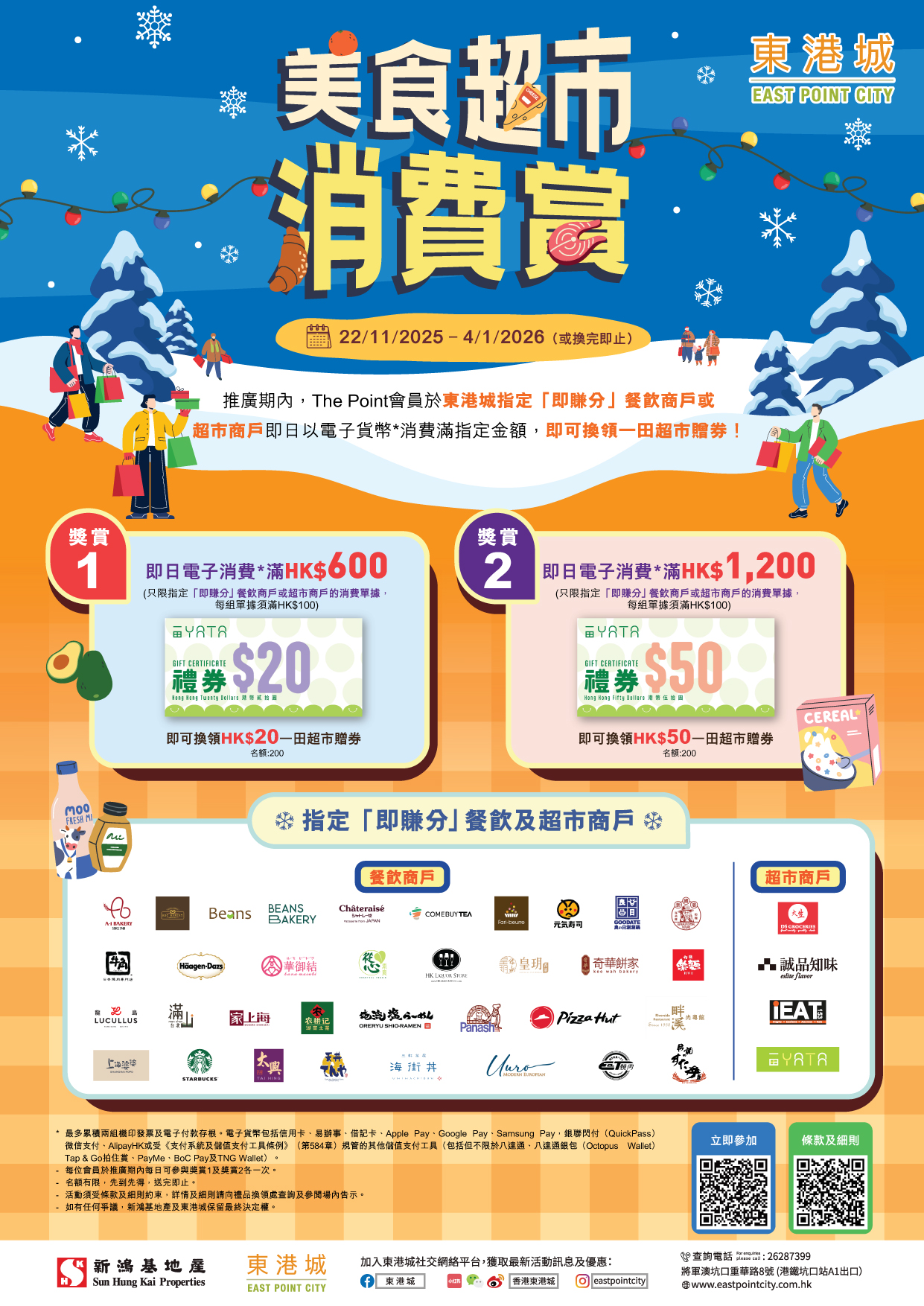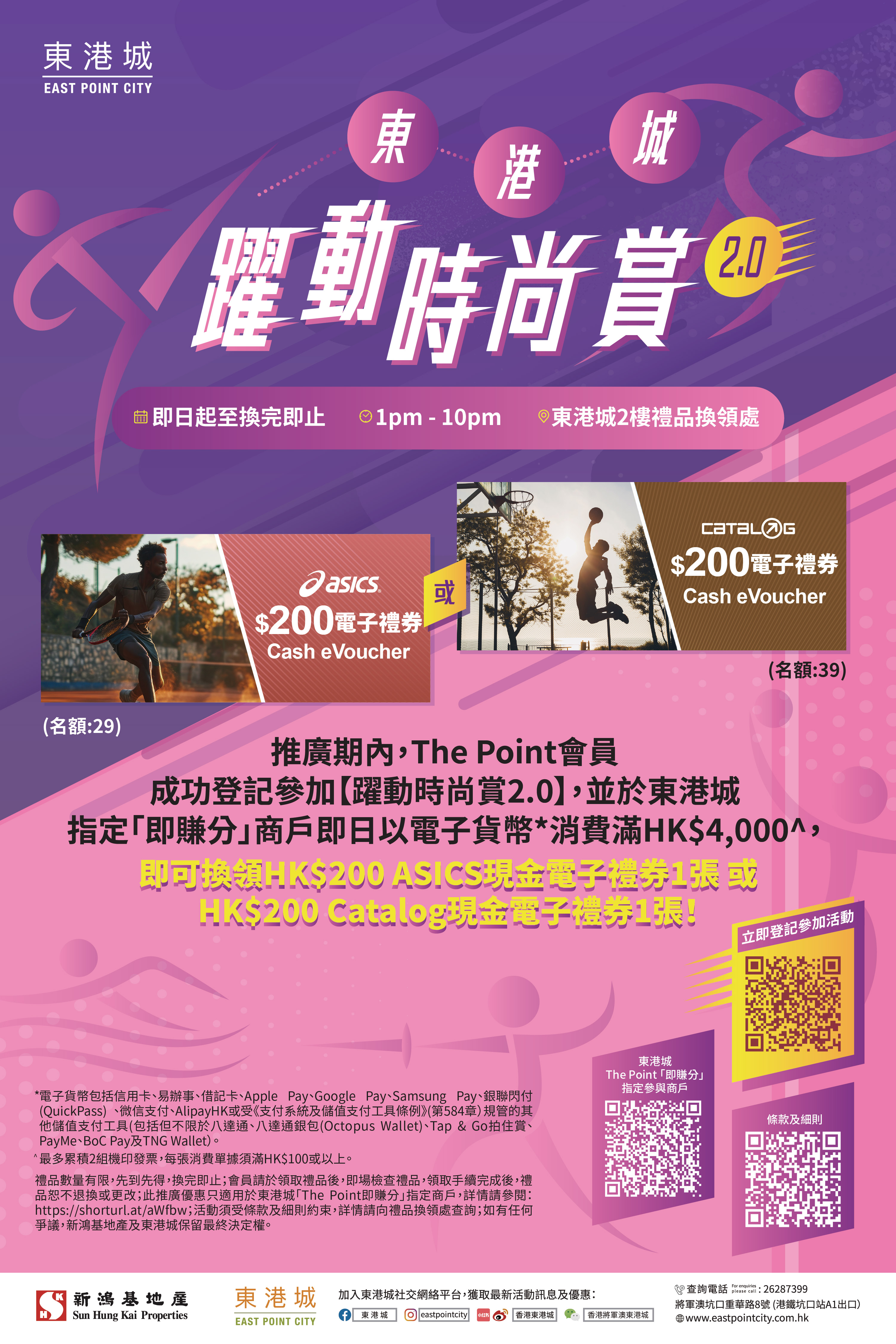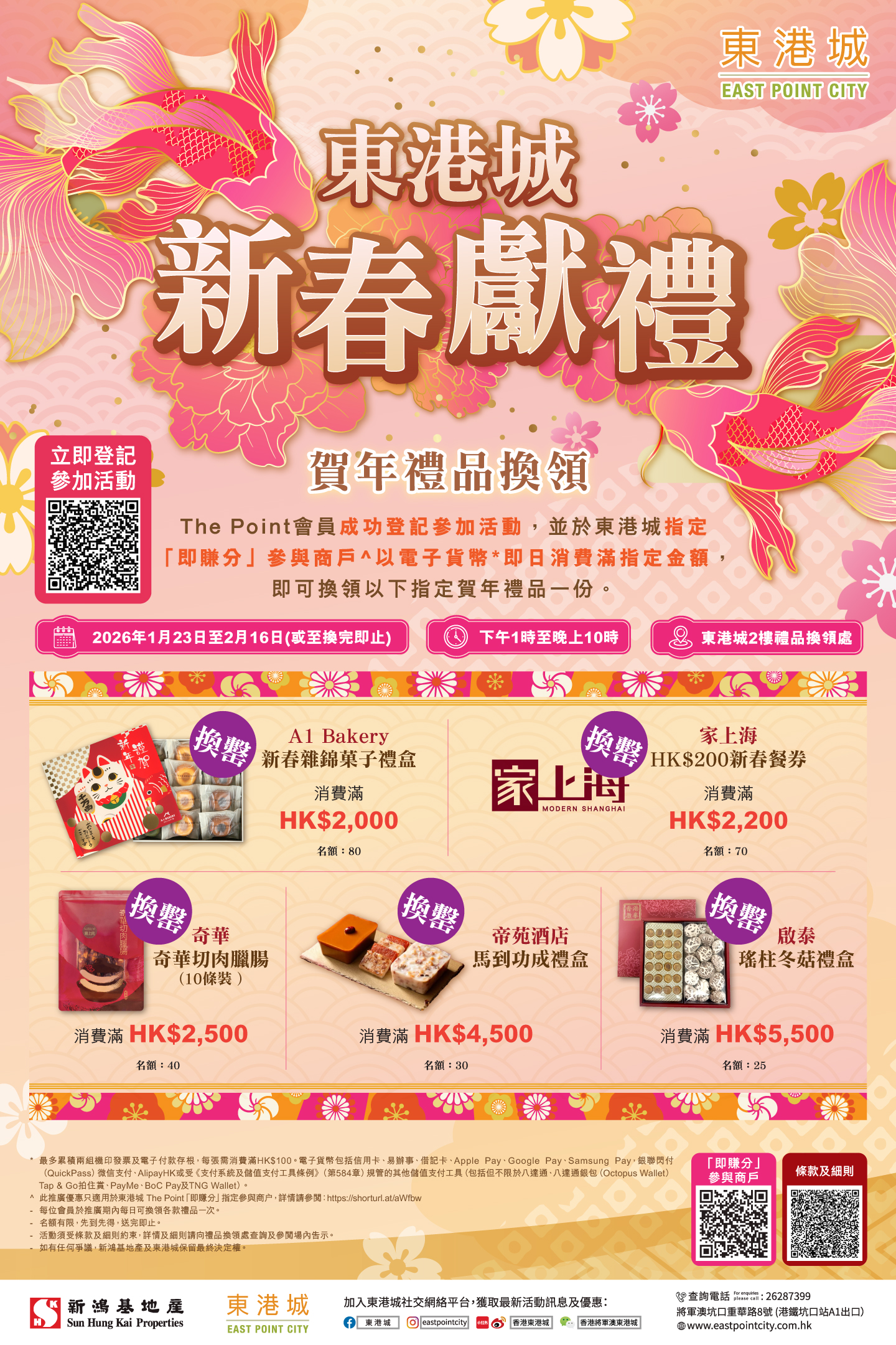 最新活動 昔日活動 活動年份 所有年份 所有年份 迎春年貨購物賞 2026年2月2日 - 2026年3月3日 東港城情人節禮品換領 2026年1月30日 - 2026年2月14日 免觸式自動起閘離場及 The Point會員自助辦理泊車優惠服務暫停 2026年1月28日 - 2026年1月30日 東港城第20屆新春花展會「花開千駿迎新春」 2026年1月23日 - 2026年2月16日 東港城新春獻禮 – 賀年禮品換領 2026年1月21日 - 2026年2月16日 東港城第20屆新春花展會「花開富貴迎駿馬」揭幕禮 2026年1月16日 - 2026年1月20日 新地商場.東亞銀行卡簽賬獎賞 2026年1月15日 - 2026年2月28日 滙豐信用卡最紅全年優惠 (2026年度) 2026年1月1日 - 2026年12月31日 「中銀信用卡全年任務賞2026」 2026年1月1日 - 2026年12月31日 東港城美食超市消費賞 (30/12) 2025年12月30日 - 2025年12月30日 東港城 – 「千格玲瓏」利是封換領 2026年1月16日 - 2026年2月16日 東港城新春駿樂園 feat. LeonLollipop 2026年1月10日 - 2026年3月3日 《全民造星VI》11強記者會 2025年12月15日 - 2025年12月27日 東港城 – 躍動時尚賞 2.0 2025年12月4日 - 2025年12月22日 冬日至尊Phone狂賞 2025年12月9日 - 2026年1月4日 銀聯卡 • 新地商場賞您冬日好禮 2025年12月1日 - 2026年1月31日 WeWa / EarnMORE銀聯卡專享禮遇 2025年12月1日 - 2026年1月31日 東港城 寵物到訪守則 2025年11月28日 - 2026年12月31日 東港城美食超市消費賞 2025年11月22日 - 2025年12月29日 東港城 – 躍動時尚賞 2025年11月10日 - 2025年11月23日 東港城.miffy星河祈願之旅 2025年11月10日 - 2026年1月3日 Thanksgiving 星級消費賞 2025年11月5日 - 2025年12月8日 東港城 – SPORT FEVER 運動狂熱《運動大激賞》 2025年10月31日 - 2025年11月21日 東港城星河祈願之旅揭幕禮 2025年10月23日 - 2025年11月9日 東港城《金式森林》記者會 2025年10月3日 - 2025年10月3日 萬聖節聯歡戶商户優惠 2025年10月24日 - 2025年11月24日 《東港城 萬聖魅影派對》 2025年10月10日 - 2025年10月24日 東港城 10.1 國慶有禮 2025年9月25日 - 2025年10月1日 新地商場 • 中銀信用卡簽賬獎賞 2025年9月15日 - 2025年11月30日 美食超市消費賞 2025年9月10日 - 2025年10月26日 東港城 X 《我愛九龍城》記者會 2025年8月29日 - 2025年9月7日 Gadget Lovers 最高消費賞 2025年9月1日 - 2025年10月31日 東港城中秋節主題禮品換領 2025年9月5日 - 2025年10月6日 夏日最高消費賞 2025年8月1日 - 2025年8月31日 東港城 X 中三夏日感謝祭記者會 2025年7月21日 - 2025年8月1日 The Point x VISA消費雙重賞 2025年6月24日 - 2025年8月31日 東港城 x Rock My Soul 2025年7月17日 - 2025年8月2日 新地商場禮品卡流動支付額外賞 2025年7月2日 - 2025年12月31日 滙豐信用卡暑假賺分攻略 2025年7月1日 - 2025年9月14日 新地商場 • 滙豐信用卡最紅大折日2025 2025年7月1日 - 2025年9月14日 東港城 X BANGGRI 烘焙夢工場 2025年7月5日 - 2025年8月20日 東港城7.1慶回歸優惠合集 2025年6月23日 - 2025年7月31日 盛夏時尚狂熱賞 2025年6月25日 - 2025年8月31日 東港城 x 張與辰《深海》新歌發佈會 2025年6月19日 - 2025年7月5日 東港城《刑偵12》記者會 2025年6月10日 - 2025年6月10日 初夏最高消費賞 2025年6月2日 - 2025年7月15日 東港城美食超市日日賞 2025年6月2日 - 2025年8月17日 全民造星VI記者會-入場證換領 2025年5月21日 - 2025年5月31日 西貢一日遊 優惠指南 2025年5月22日 - 2025年6月21日 東港城 父親節禮品換領 2025年6月2日 - 2025年6月15日 東亞銀行信用卡客戶專享 2025年5月16日 東港城端午節獻禮 2025年5月9日 - 2025年5月31日 東港城寢夢春日賞 2025年4月22日 - 2025年8月25日 【東港城 x 將軍澳中心 x PopWalk 天晉滙】將軍澳泊車賞 2025年5月1日 - 2025年7月31日 東港城 母親節獻禮 2025年4月29日 - 2025年5月11日 東港城 黃金Phone狂賞 2025年4月23日 - 2025年6月1日 東港城時裝及運動服飾電子贈券之認受商家名單 2022年4月1日 - 2030年12月31日 新地商場 • 新地會星級會員泊車優惠 2025年1月1日 - 2025年12月31日 東港城 x 《中年好聲音3》十強見面會 2025年4月4日 - 2025年4月18日 東港城 x GIN LEE 李幸倪簽唱會 2025年3月7日 - 2025年3月9日 新地商場 • 渣打信用卡 2025年3月1日 - 2025年5月15日 新地商場禮品卡 ● WeWa/EarnMORE信用卡限時優惠 2025年3月4日 - 2025年3月31日 東港城 春日最高消費賞 2025年2月24日 - 2025年4月22日 電車充電購物激賞 2025年2月14日 - 2026年12月31日 東港城 – 春日美食超市消費賞 2025年2月24日 - 2025年3月31日 【東港城 x 將軍澳中心 x PopWalk 天晉滙】將軍澳泊車賞 2025年2月15日 - 2025年3月31日 東港城 x TMG周吉佩及吳業坤新歌發佈會 2025年2月18日 - 2025年3月1日 東港城 – Welcome旅客Double 賞 2025年11月28日 - 2025年6月30日 東港城 – 情人節花之浪漫樂章 2025年2月8日 - 2025年2月14日 招商銀行信用卡專享 2025年1月23日 - 2025年3月26日 東港城 – 情人節獻禮 2025年2月1日 - 2025年2月14日 東港城「花語心願」新春佈置 2025年1月8日 - 2025年2月23日 東港城新春賀禮賞 2025年1月6日 - 2025年2月23日 新地商場 • 中銀信用卡 全年任務賞 2025 2025年1月3日 - 2025年12月31日 東港城 「雍容華貴 矜貴閃爍」利是封 2025年1月8日 - 2025年1月28日 新地商場 • 匯豐信用卡最紅全年優惠 2025 2025年1月1日 - 2025年12月31日 東港城 – 新春獻禮 2025年1月10日 - 2025年1月28日 新地商場 ‧ 恒生信用卡玩轉個獎賞 2025年1月2日 - 2025年2月28日 東港城 新春最高消費賞 2025年1月2日 - 2025年2月24日 東港城 New Year’s Rhythm 2024