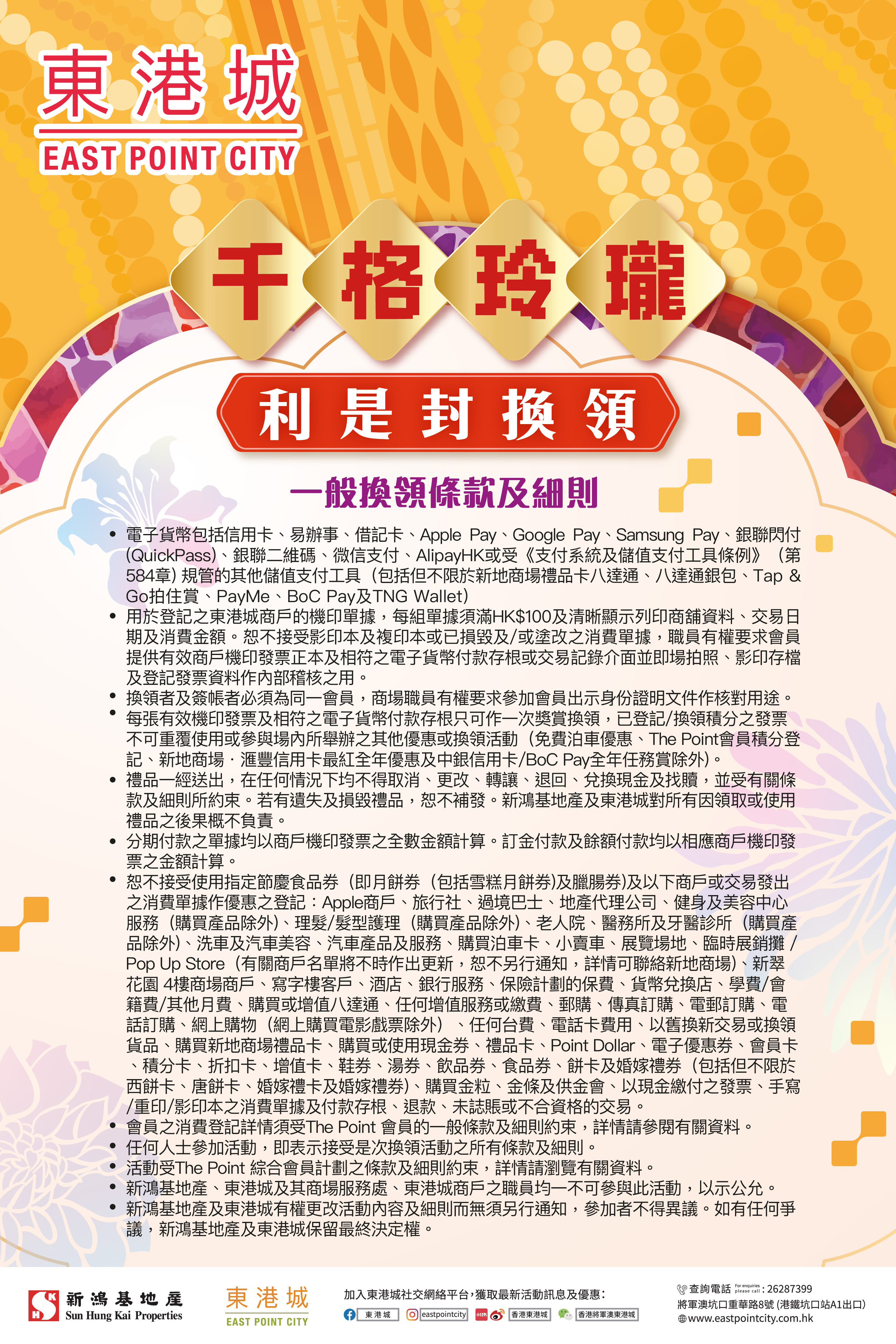 東港城 – 「千格玲瓏」利是封換領 推廣日期:2026年1月16日至2月16日(或至換完即止) 換領時間: 下午1時至晚上10時 換領地點: 2樓禮品換領處 換領方法:The Point會員成功登記參加活動, 並於東港城指定「即賺分」參與商戶即日電子消費滿HK$800(最多累積2張不同商戶發出之即日單據,每張須消費滿HK$100)即可換領「千格玲瓏」利是封一套(每套4款各2個) (數量有限,換完即止,受條款及細則約束) 按此立即參加!