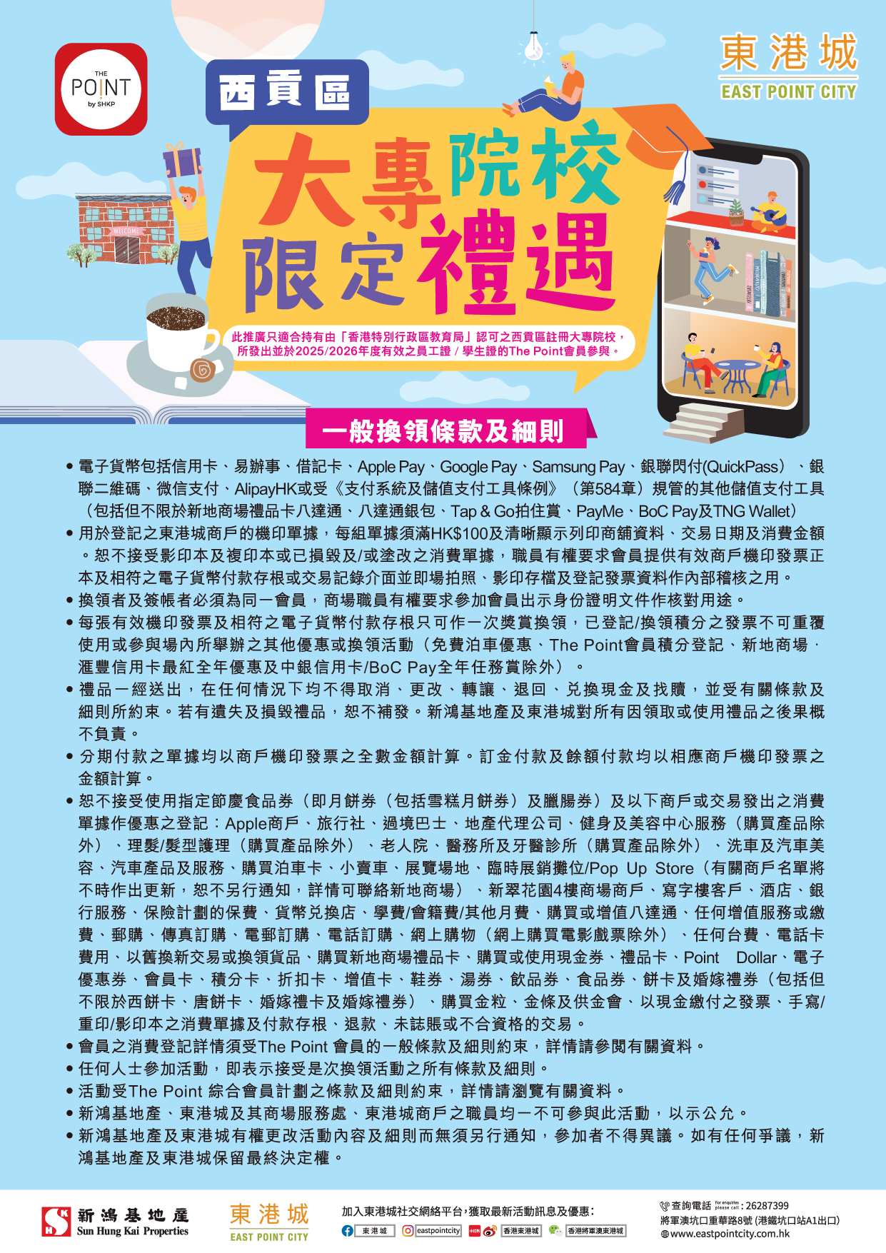 推廣期內,持有效西貢區大專院校員工證/學生證之The Point會員,成功登記參加【西貢區大專院校限定禮遇】活動,並於東港城「即賺分」商戶完成指定消費,在14日內憑電子換領券親臨東港城2樓禮品換領處(10am-10pm),即可換領即可享以下雙重禮遇。先到先得,換完即止。