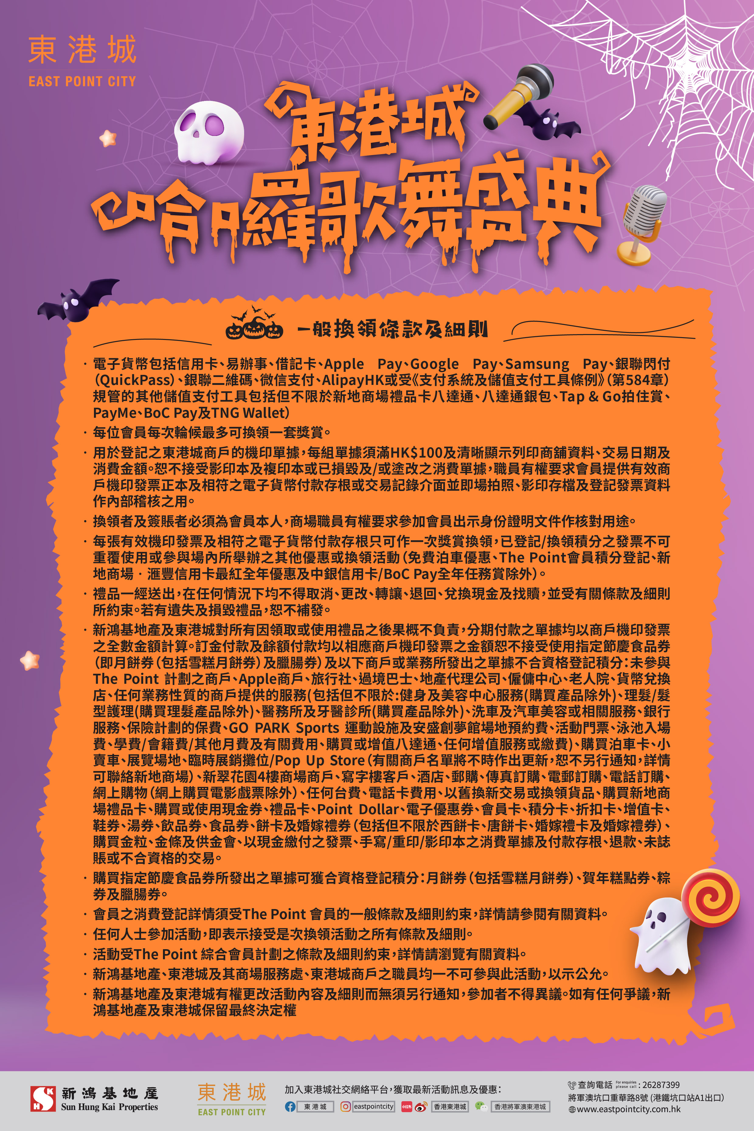 換領詳情:The Point會員於東港城指定「即賺分」參與商戶* 以電子貨幣即日消費滿 HK$3,000^ ,即可換領活動入場證1張 + 東港城 HK$100 零售電子贈卷(名額:200個)