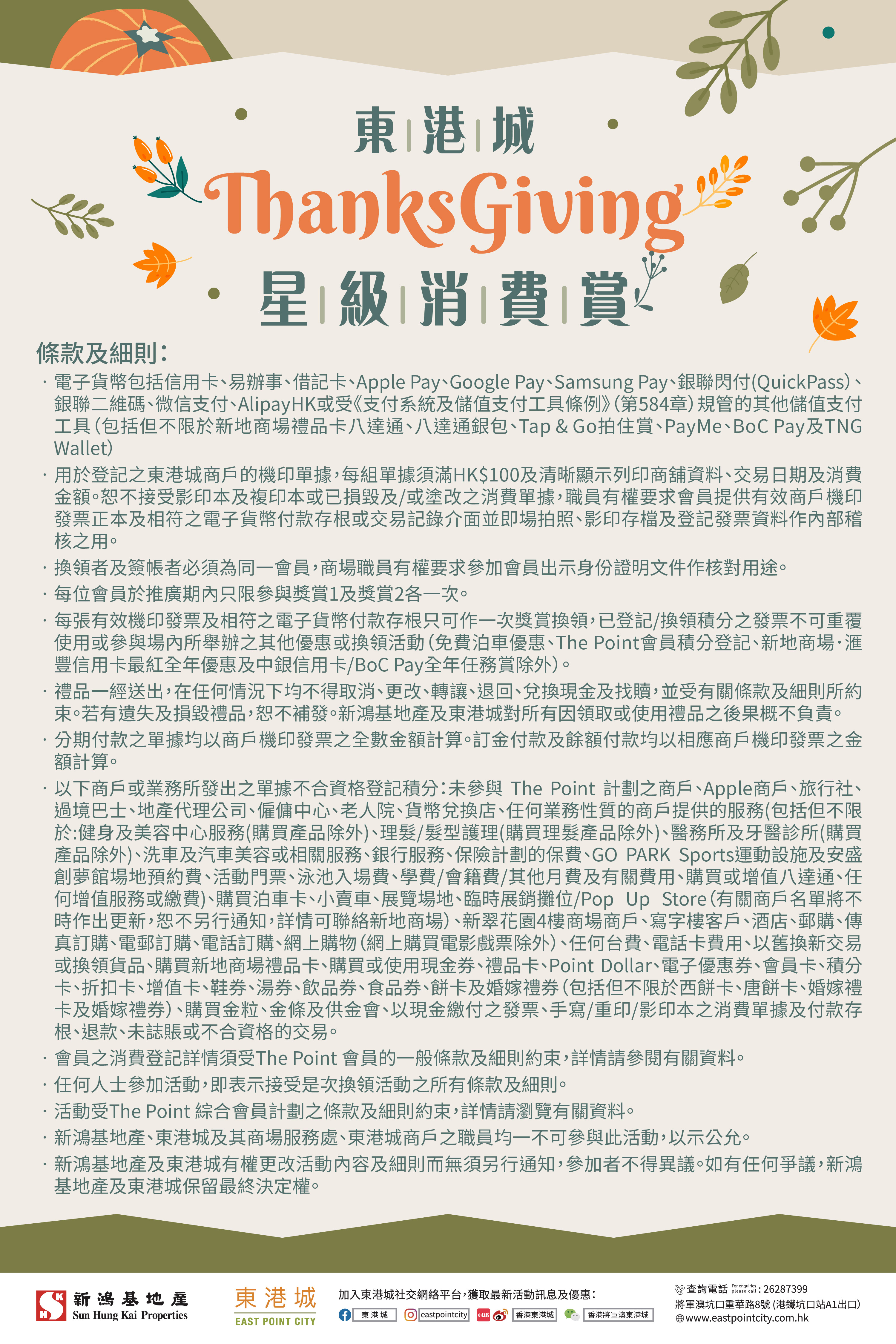 · 獎賞2:即日電子消費*滿HK$60,000#,即可換領HK$2,500東港城電子贈券組合^(HK$500東港城零售電子贈券5張)(名額:20)