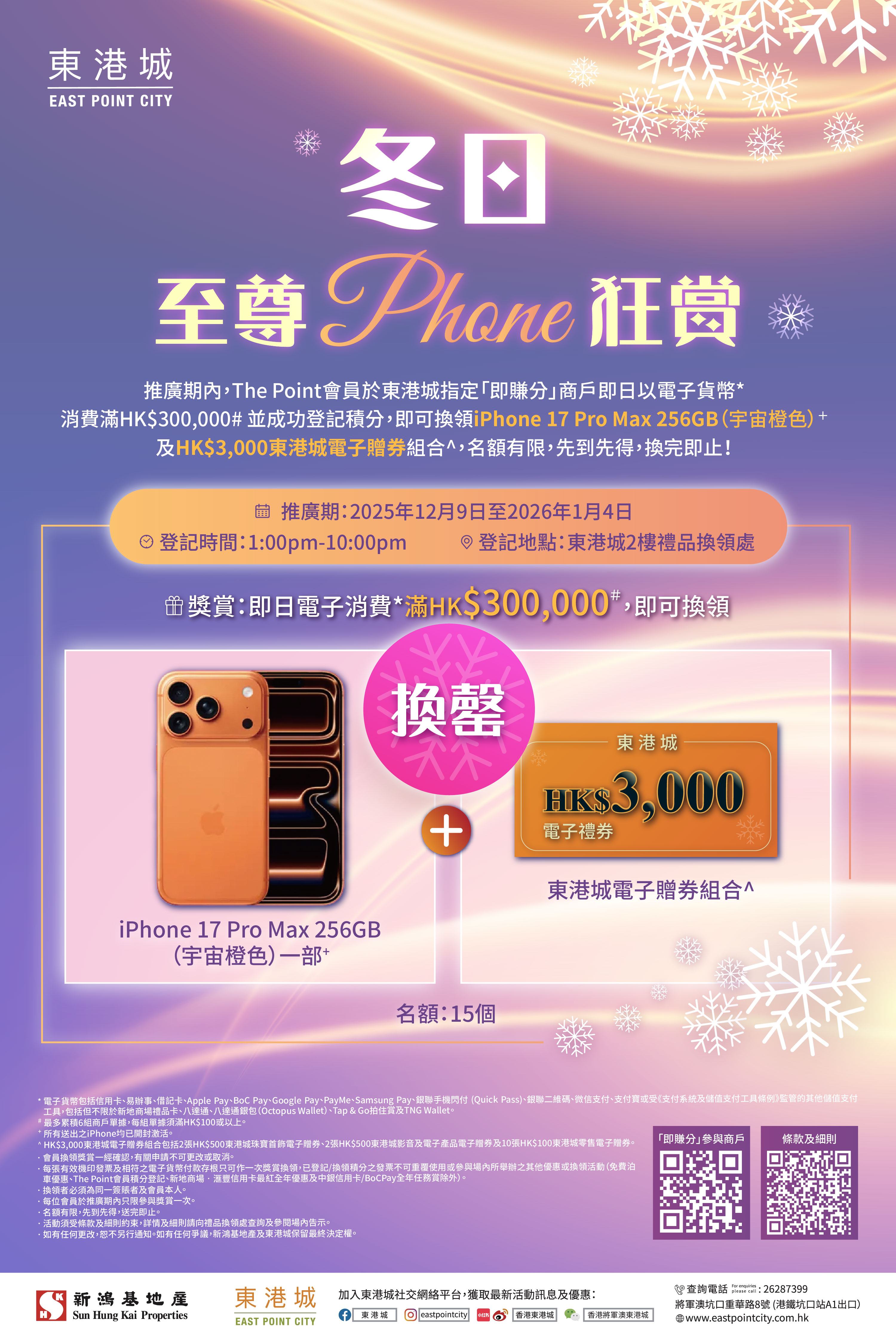 推廣期內,The Point會員於東港城指定「即賺分」商戶即日以電子貨幣*消費滿HK$300,000並成功登記積分,即可換領iPhone 17 Pro Max 256GB(宇宙橙色)+ 及HK$3,000東港城電子贈券組合^!(換罄)